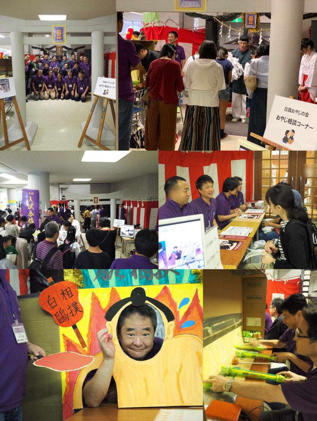 事前準備。おやじたちが短期間で作り上げていきます!クオリティが高い!! 縁日を題材とした今年の白鴎祭。神主が合格祈願をして、受験生を盛り上げました。注意:合格を約束するものではありません。 わにわにパニックや腕相撲、輪投げといった遊び場とともに作り上げたのが白鴎神社! 入学希望の方に経験者として相談にのるおやじの相談コーナー。白鴎腕相撲では挑戦者との対戦で盛り上がりました。 最後はみなで片づけて、打ち上げで疲れを癒しました |